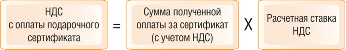 Таким образом, при получении организацией (продавцом) оплаты подарочного сертификата от покупателей в счет предстоящей поставки товаров у организации (продавца) возникает объект налогообложения по НДС. Указанные суммы оплаты подлежат обложению НДС исходя из полученных сумм с учетом НДС по расчетной налоговой ставке 20/120 или 10/110 (абз. 2 п. 1 ст. 154, п. 4 ст. 164 НК РФ).